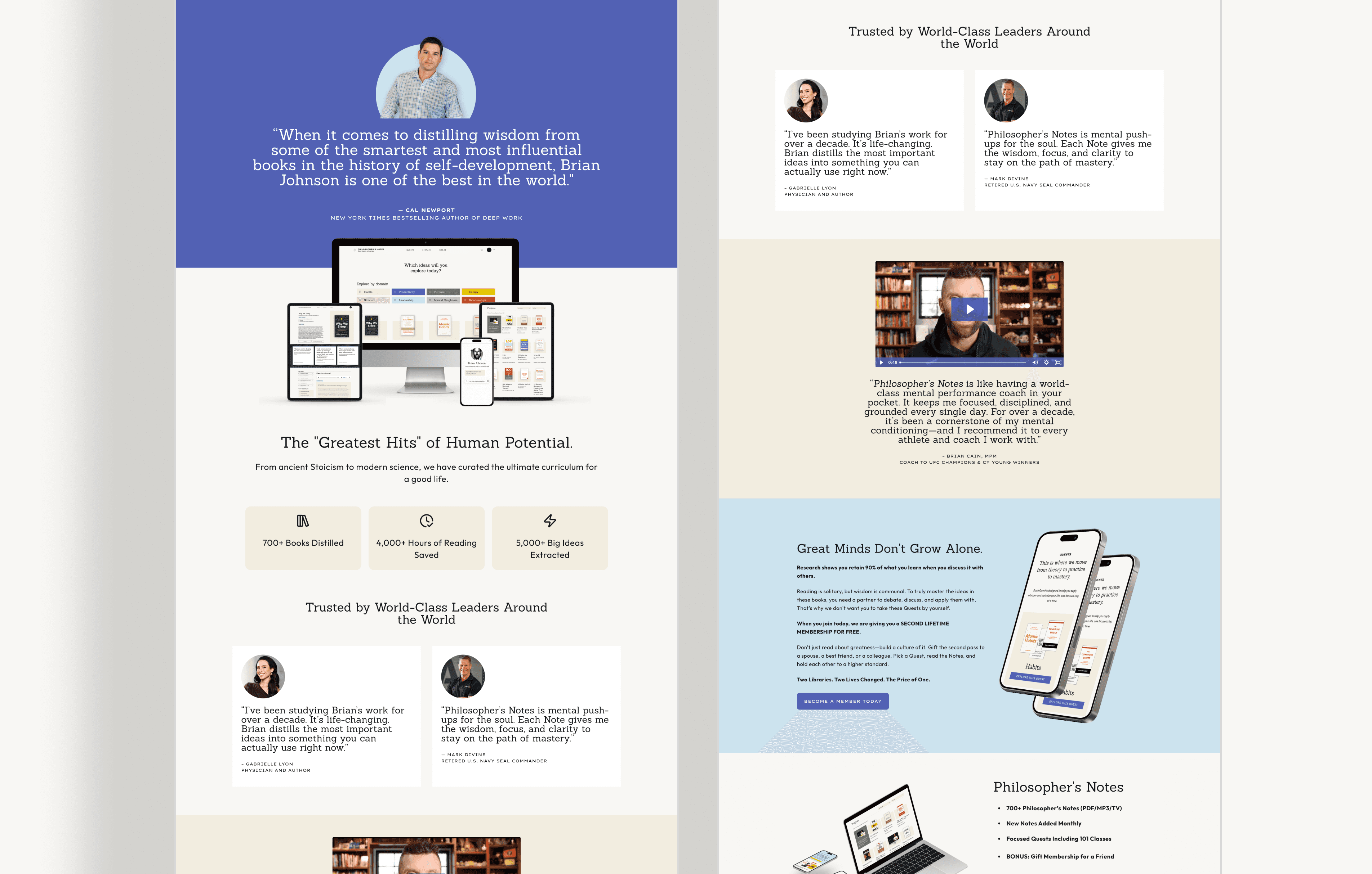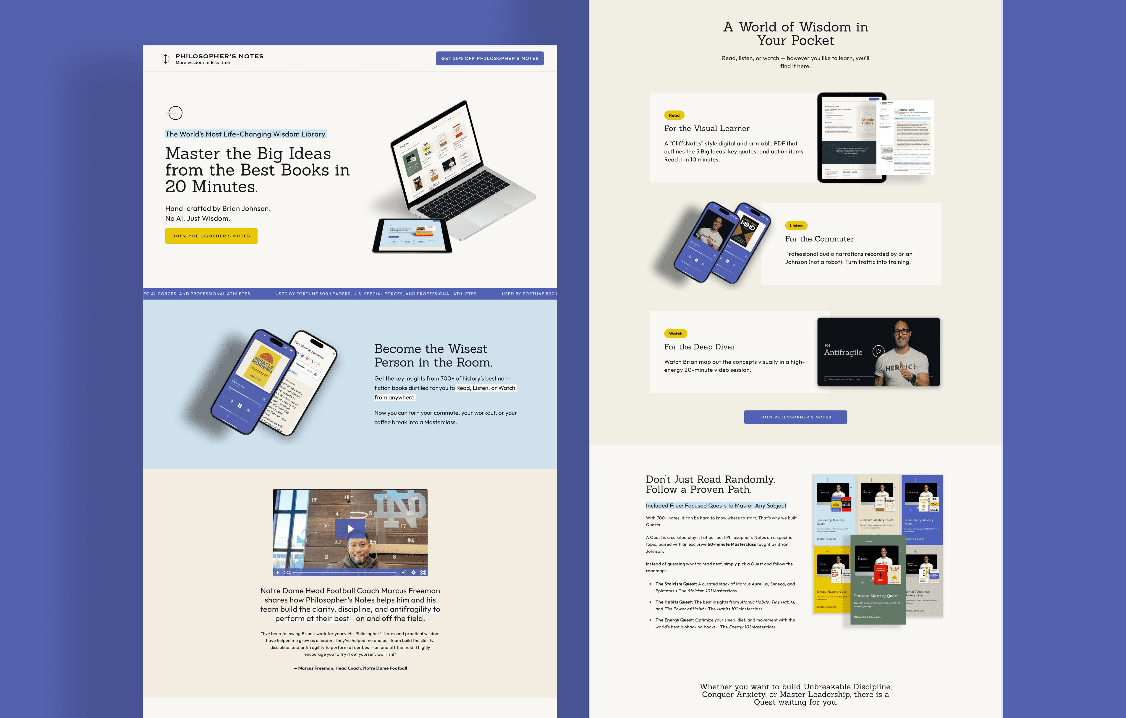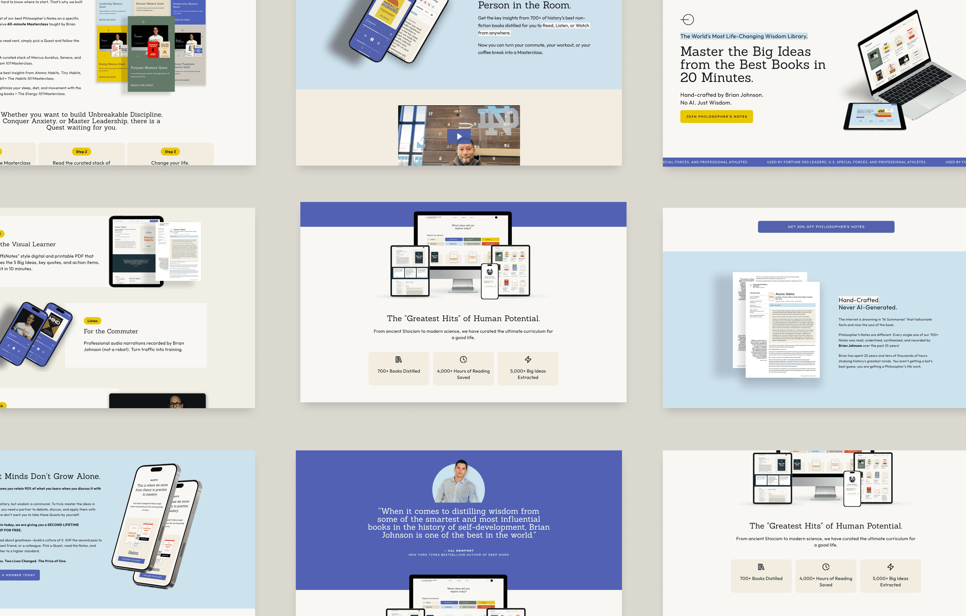 Philosopher's Notes isn't just a product page. It lives across 2 marketing websites, a web app, a native mobile app, email flows in Klaviyo, partner dashboards, YouTube, paid ads, and sales decks.
