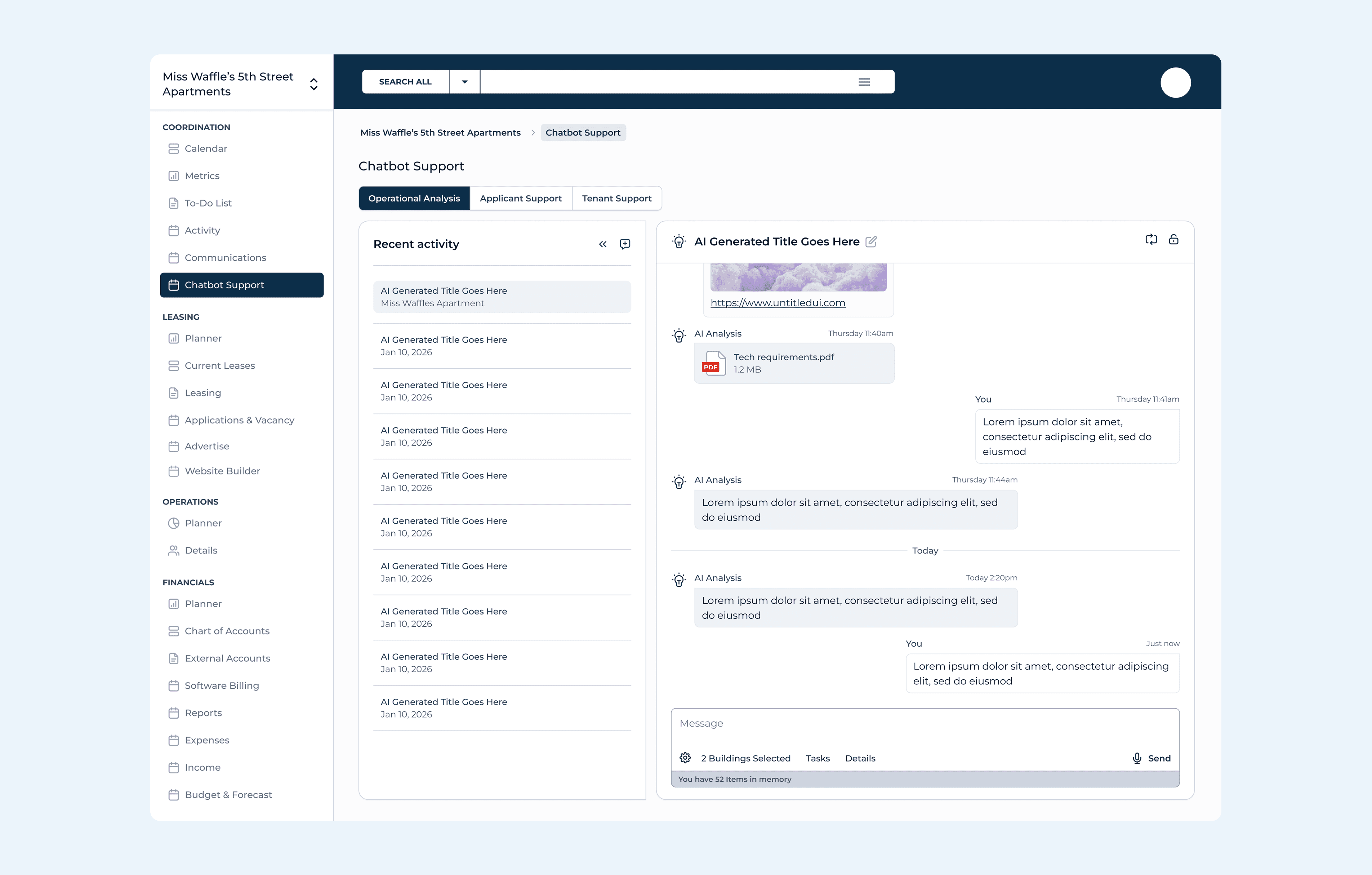 AI chatbot interface for operational analysis and tenant support