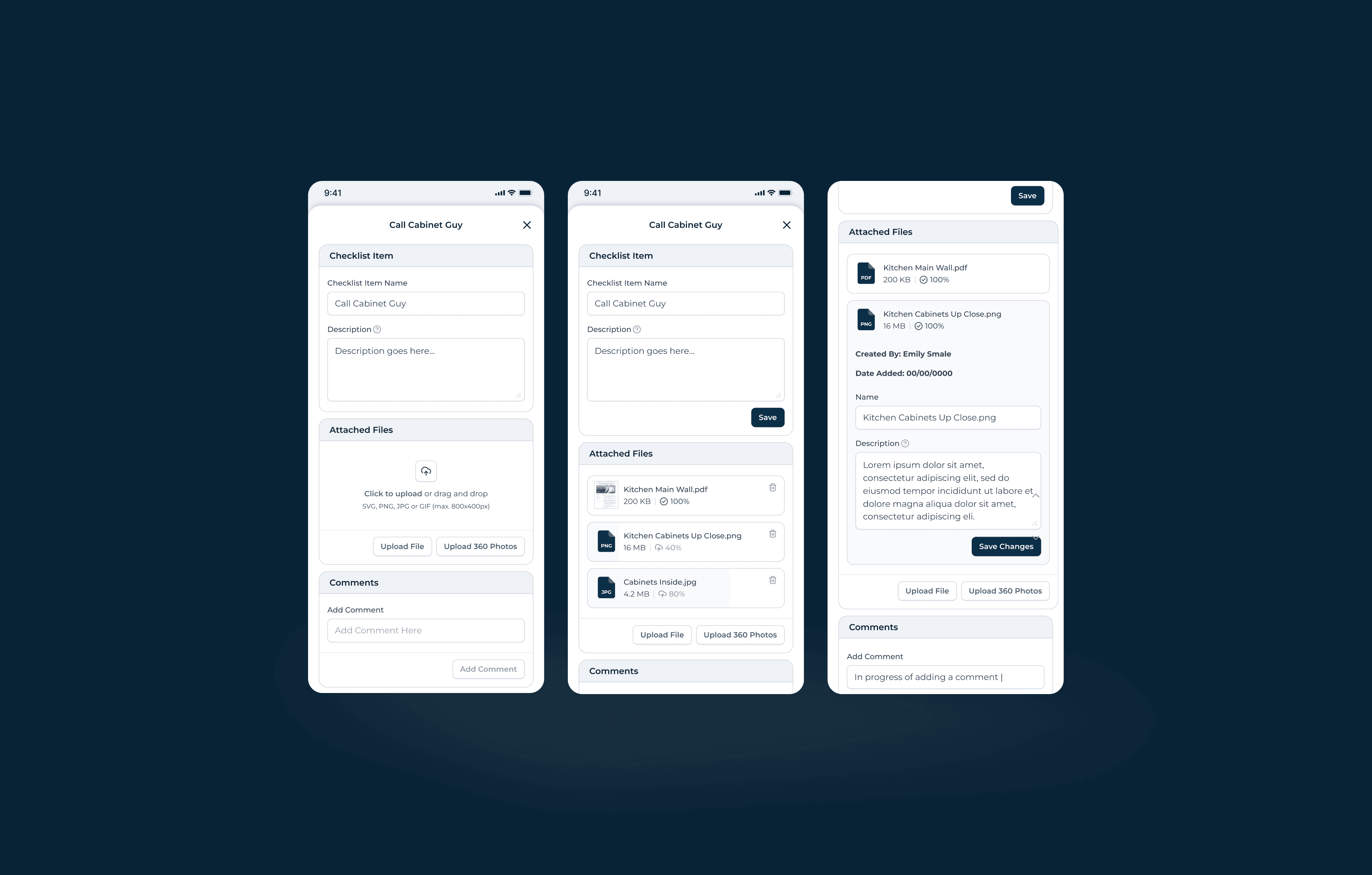 I established reusable patterns for the most common interactions: data tables with sortable columns, status chips, and pagination; 3/4 flyout panels for detail views; full-page modals for complex forms; inline editing for tasks; and a consistent card-based layout for observations, comments, and file attachments.