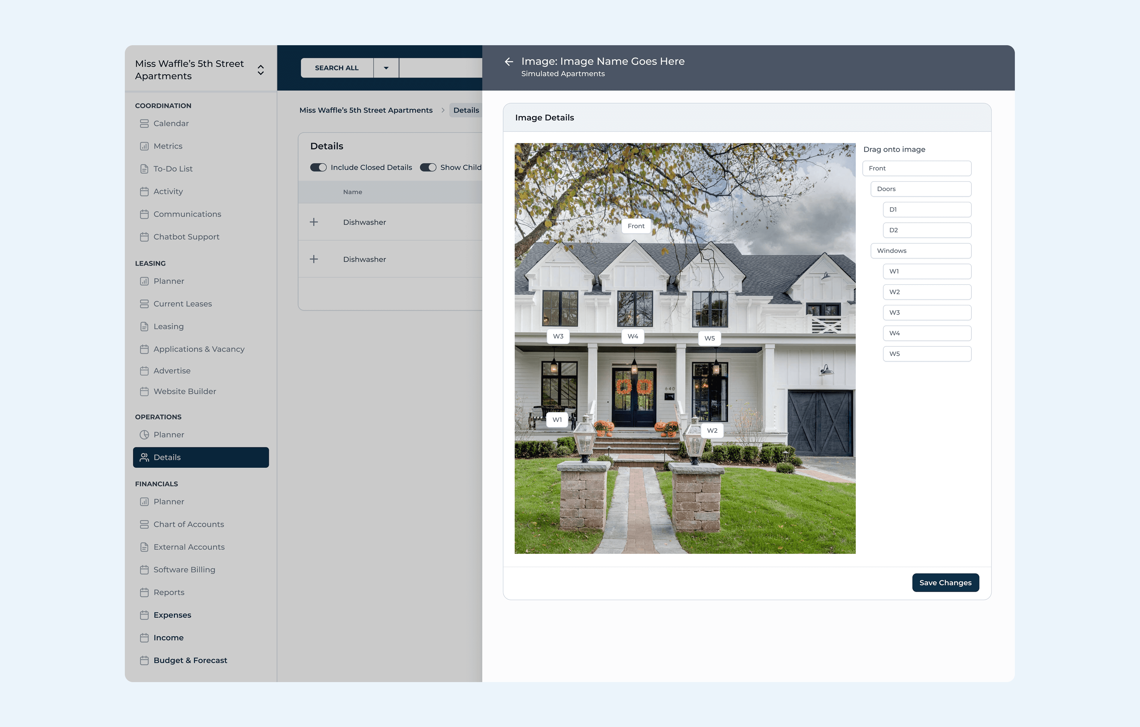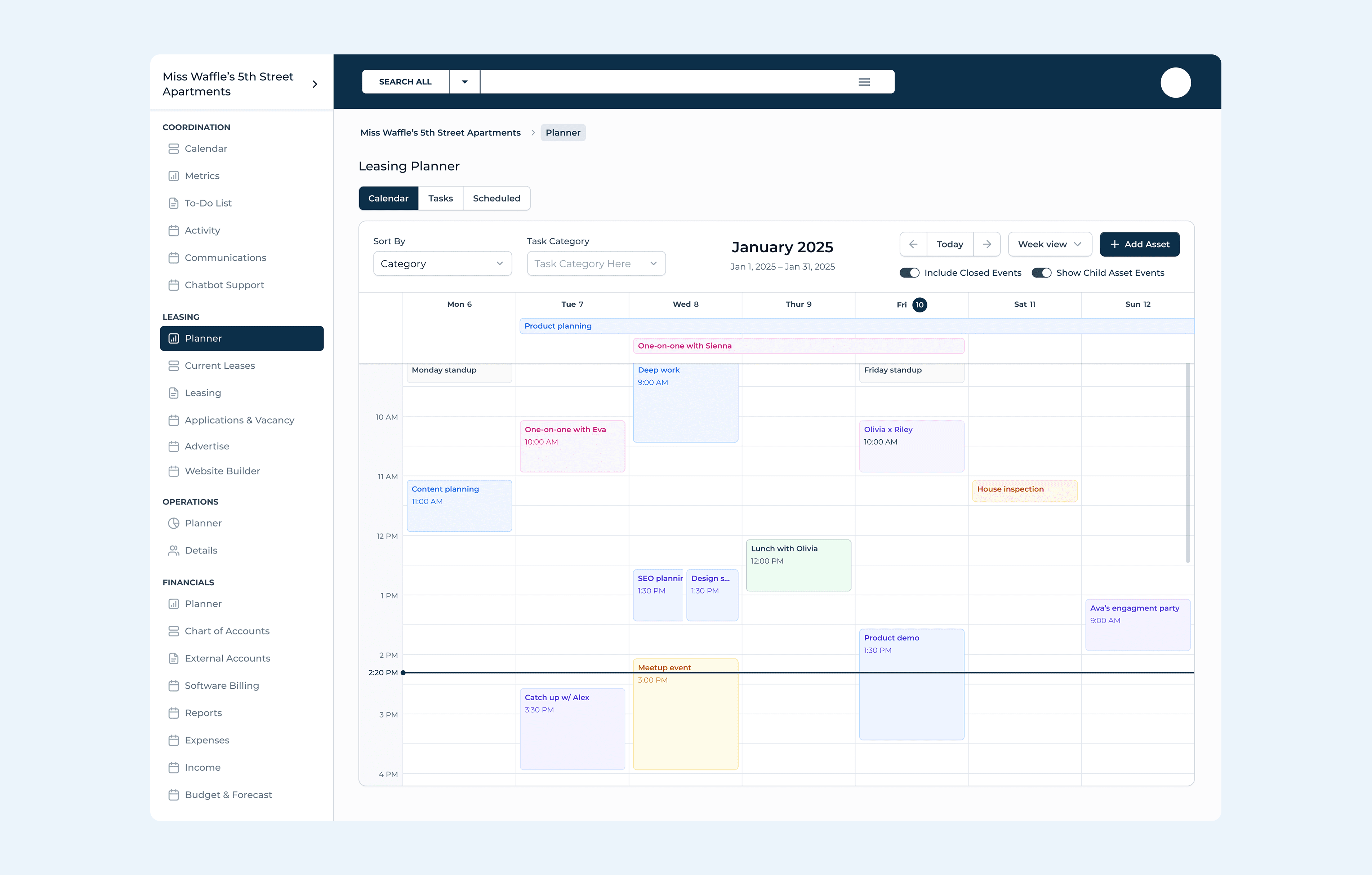 The sidebar navigation organizes the entire platform into four clear domains: Coordination (calendar, metrics, tasks, communications), Leasing (planner, current leases, applications, advertising, website builder), Operations (planner, details), and Financials (accounts, billing, reports, budget & forecast).